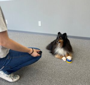 1. クリッカーを鳴らし、オヤツを床に転がします。